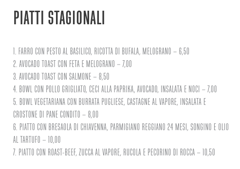 Post – Workout Consigliato – I piatti stagionali si prestano come ottimo post-workout, risultando da una composizione equilibrata di proteine, carboidrati e grassi sani. Valide anche le opzioni del menu insalate.